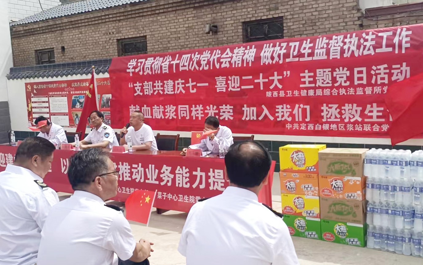陇西县卫生健康局综合执法监督所党支部、定西白银地区浆站联合党支部、菜子中心卫生院党支部和菜子中心卫生院雪山分院党支部,联合开展“支部共建,庆七一,喜迎二十大”主题党日活动。定西白银地区浆站联合党支部书记任红卫同志做了关于“献血浆、送温暖,筑牢疫情防控防线”专题报告,为感谢所有医务人员在抗击疫情中的辛勤付出,特意为他们送上消暑慰问品。